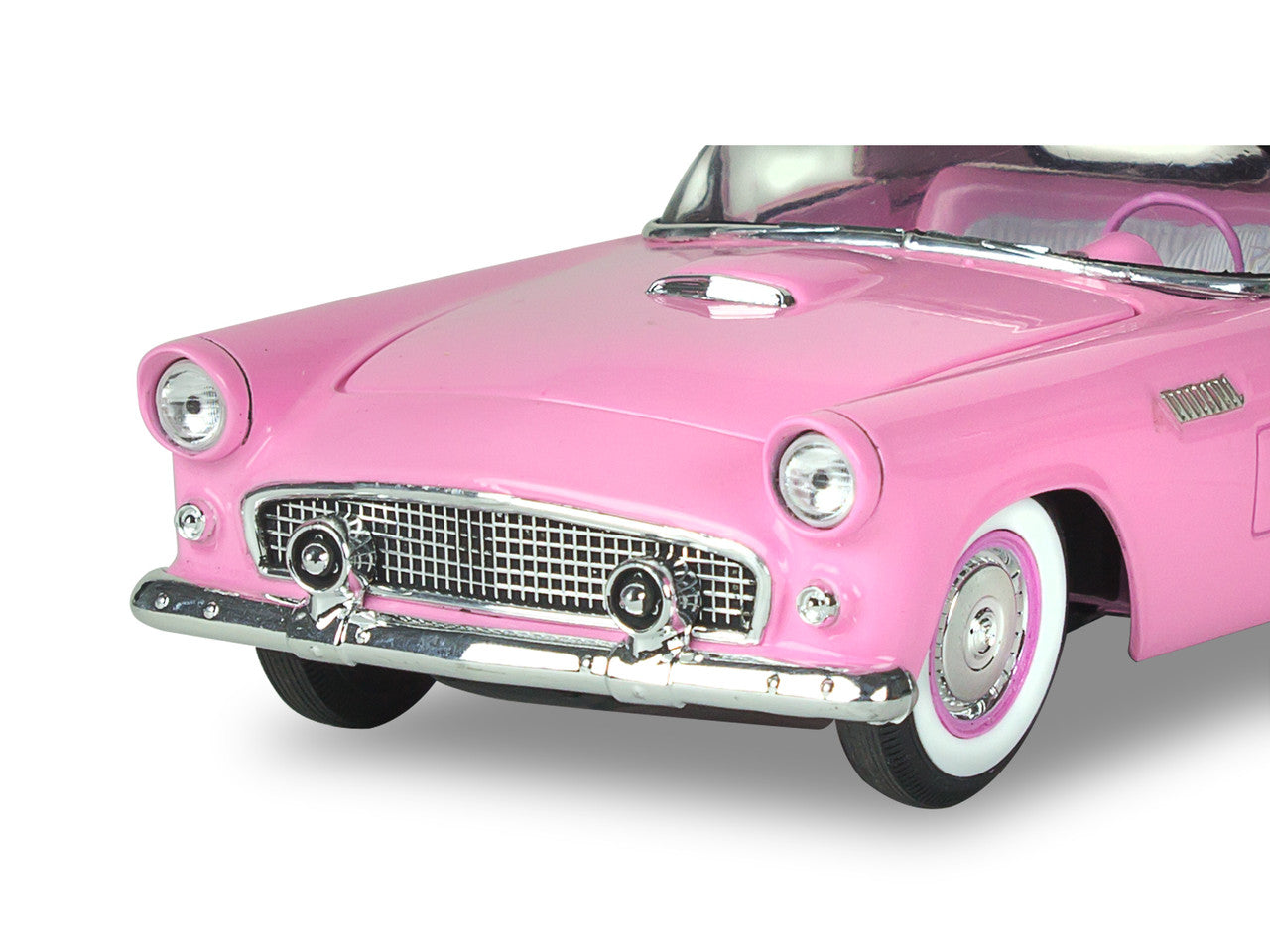 The first generation Ford Thunderbird was produced from 1955 to 1957, the first 2-seat Ford since 1938 and countering Chevrolet’s 1953 introduction of the Corvette. The 1956 Ford Thunderbird 2-door convertible had a base price of $3,150 and over the three-year production period, a total of 53,166 were produced. It was an all-new concept in motoring called the 'personal luxury' car, offering sporty performance in luxury and comfort. For the 1956 model year, rectangular fresh air vents were added to the front fenders and exhaust tips were moved to the ends of the bumper. A “Continental Kit” was added to house the spare tire to increase trunk space. An optional 312 cubic inch V-8 engine was offered to maintain the car’s performance in view of the unavoidable weight increase. To improve rear-quarter visibility with the removable hardtop in place, "porthole" windows were available as a no-cost option.