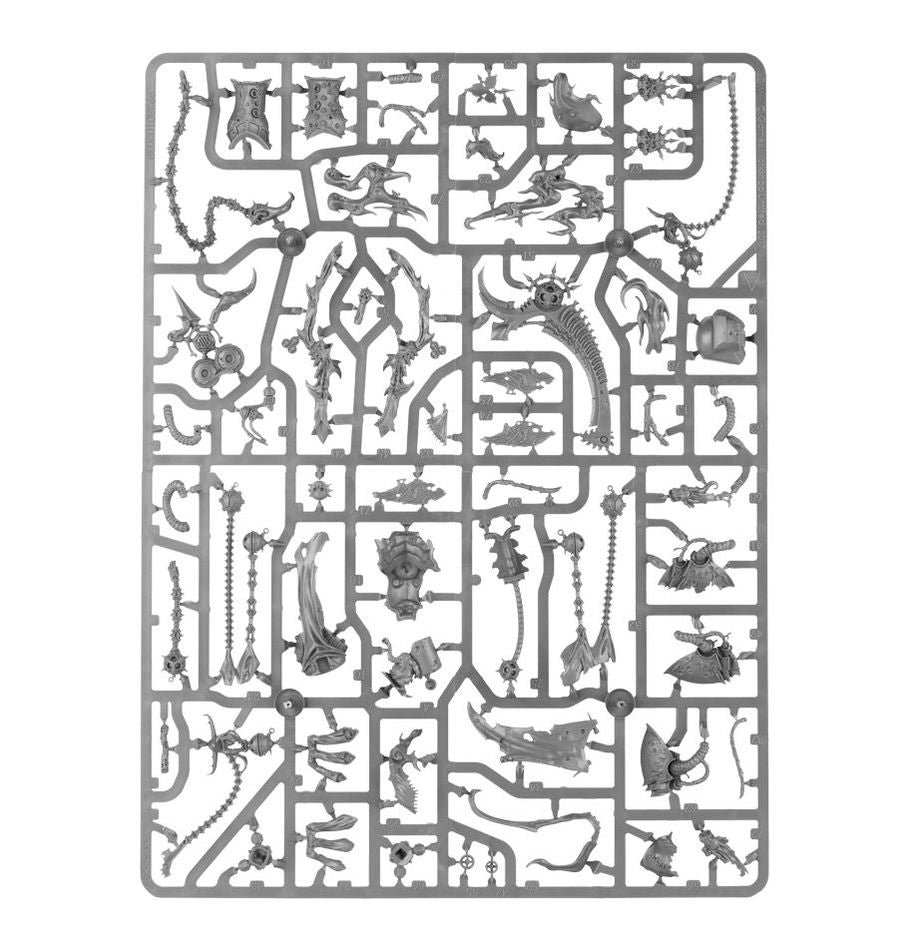 This multi-part plastic kit contains the components necessary to assemble Mortarion, Daemon Primarch of Nurgle. This is a towering model – the word ‘miniature’ barely does it justice, as he looms over the rest of the Death Guard and gives even Bloodthirsters something to look up to! He is clad in baroque power armour known as the Barbaran Plate – this is covered in rust and rot, with skulls, spikes and Nurgle symbolism on each of the chunky components. Mouldering robes, chains and a rotten cowl hang from this armour, partially covering the system of pipes that feed his breathing apparatus – it is safe to assume that this ventilator isn’t delivering fresh and clean air to Mortarion, rather vile spores and disease.