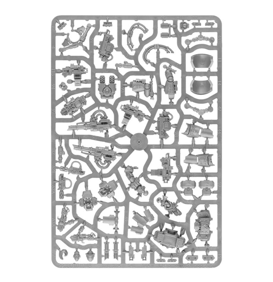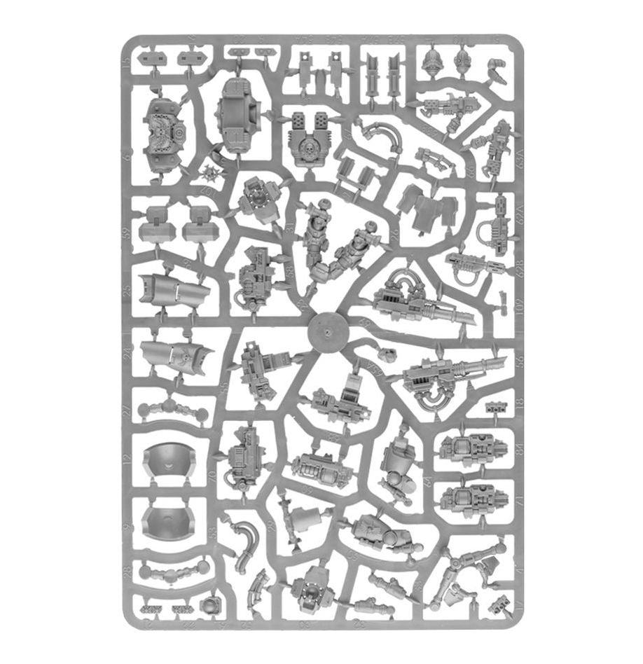 The Centurion Devastator Squad’s arms can be equipped with either twin-linked heavy bolters, twin-linked lascannons; or grav cannons and grav-amps. The chest plates can be armed with either a hurricane bolter or a missile launcher.